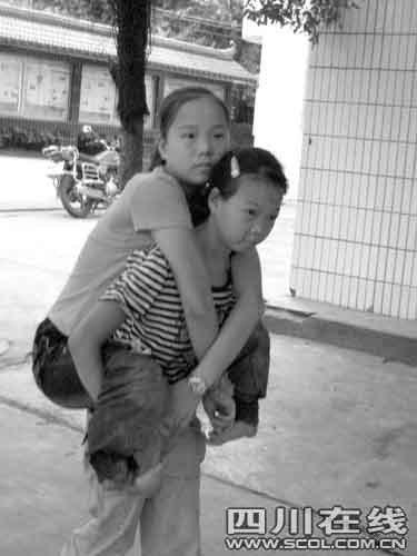 昨日上午第三節(jié)課下課鈴聲一響,初三一班的王琴就趕緊跑出教室,來(lái)到初三三班教室,走到姐姐王利面前:“姐,走,我背你上廁所!逼渌瑢W(xué)主動(dòng)騰開(kāi)位置,只見(jiàn)瘦小的王琴蹲下半個(gè)身子,微胖的姐姐王利努力將雙手放在妹妹的雙肩上,妹妹用雙手托起姐姐的兩只大腿,然后甩開(kāi)了大步。