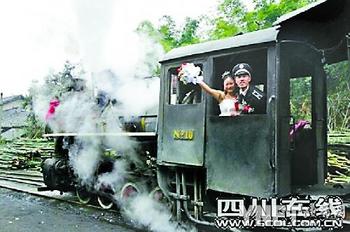 12日清晨,犍為縣嘉陽(yáng)小火車石溪火車站,一列小火車像往常一樣緩緩開(kāi)出。綢花、彩帶、氣球……裝飾一新的小火車顯得喜氣洋洋。在這里,以前都是火車司機(jī)當(dāng)“配角”,見(jiàn)證新人的婚禮,這一回,作為新郎官的楊光華成了主角——他開(kāi)著小火車,迎娶回了自己的新娘。楊光華也成為第一位包犍為縣小火車專列的新人。在鐵路邊長(zhǎng)大的楊光華,小時(shí)候的愿望是成為一名小火車司機(jī)。直到今年8月,楊光華終于如愿以償,當(dāng)上了小火車司機(jī)。