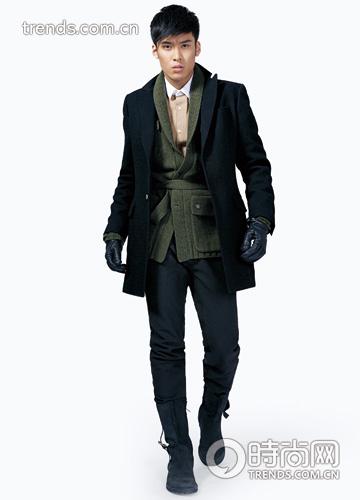 青果領(lǐng)粗線毛衣系上腰帶比普通開衫套在大衣里更能搭出俊朗的效果。