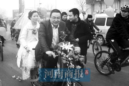 昨日,河南滎陽市民王順強(qiáng)用120輛自行車舉行了一個(gè)別開生面的自行車婚禮。
