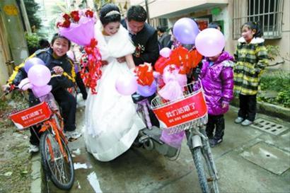 中午12點(diǎn)整,記者趕到梅隴七村,58號(hào)樓前停放著一排橘色自行車,車身飾以彩帶氣球,車頭“我們結(jié)婚了”的大幅紅字喜氣洋洋。在熱鬧的鞭炮聲和親朋好友的祝福中,新郎孫軍將身披婚紗的新娘扶上自行車后座。隨后,新郎一騎當(dāng)先,18輛“喜車”涌出了新村,一路歡歌笑語。如此“壯觀”的場(chǎng)景自然受到路人的矚目,不少市民還以為是在拍廣告,紛紛駐足觀看。