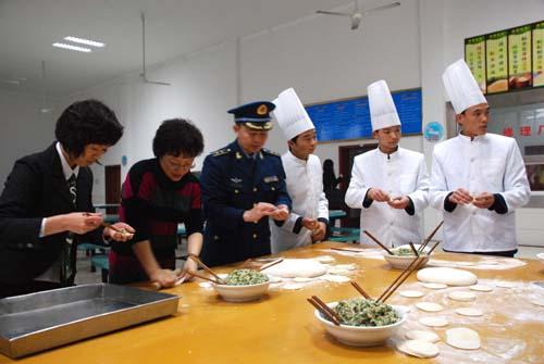 慰問(wèn)團(tuán)員與戰(zhàn)士一起包餃子