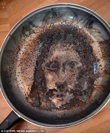 據(jù)英國《每日郵報(bào)》報(bào)道,英國一名22歲的銀行工作人員托比(Toby Elles)跟室友夜里在家中喝啤酒吃宵夜,但負(fù)責(zé)烹飪的他卻在沙發(fā)上睡著了,當(dāng)然熏肉也燒焦了,但鍋?zhàn)記]有被燒破。當(dāng)托比把燒焦的熏肉刮除后發(fā)現(xiàn),鍋中剩余的油漬痕跡就像是一張人臉,搭配頭發(fā)、胡子,看起來就跟耶穌沒兩樣。