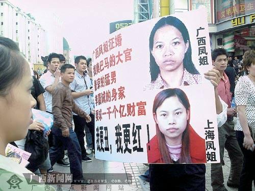 “找?jiàn)W巴馬的大官、普京的猛男、李嘉誠(chéng)的身價(jià)、要求一千個(gè)億財(cái)富……”4月11日下午,一男子在南寧市裕豐商廈門(mén)前,舉出“廣西鳳姐征婚”的廣告牌,聲稱(chēng)要為自己的一位親戚——“廣西版鳳姐”征婚。當(dāng)天在現(xiàn)場(chǎng),所謂的“廣西鳳姐”故作神秘沒(méi)現(xiàn)身,但其開(kāi)出的征婚條件卻“雷倒”了眾多圍觀(guān)市民。這也引起了一些好奇市民的猜想和質(zhì)疑:“廣西鳳姐”是不是想學(xué)新近的“網(wǎng)絡(luò)紅人”——羅玉鳳(“鳳姐”)來(lái)出名?