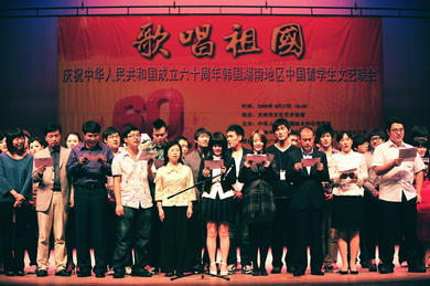 中新網9月28日電 據外交部網站報道,9月27日傍晚,來自光州市、全羅南道、全羅北道共11所大學的700名中國留學生在此歡聚一堂,參加由駐光州總領館和在韓中國留學生聯合會光州全南分會、全北分會聯合舉辦的“歌唱祖國——慶祝建國60周年韓國湖南地區(qū)中國留學生文藝晚會”。