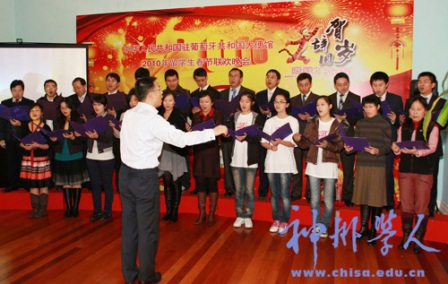隨后,聯(lián)歡晚會在《我和我的祖國》的歌聲中拉開了序幕。留學(xué)生們和使館工作人員獻(xiàn)上了形式多樣的節(jié)目:舞蹈《蒙古舞》、《金梭和銀梭》,小品《吃面》、《賣拐》,男聲獨唱《故鄉(xiāng)的云》,女聲獨唱《父老鄉(xiāng)親》,配樂詩朗誦《致橡樹》等等。精彩紛呈的表演時時引來熱烈的掌聲和喝彩聲,會場上始終洋溢著歡樂祥和的節(jié)日氣氛。