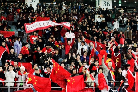 中新網(wǎng)2月11日電 據(jù)日本《中文導報》報道,2月10日,東亞四強賽進行第二輪爭奪,在東京味之素體育場中國男足迎戰(zhàn)韓國男足,中國隊最終以3-0大勝韓國隊,一舉改寫在國際A級賽事上32年對韓不勝的尷尬歷史?磁_上約二千名中國留學生的吶喊助威聲也貫穿了整場比賽。