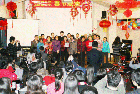 年夜飯后,教育處的老師與留學(xué)生們又組織了一臺自己的“春晚”。朱公參首先向虎年生人的老師和學(xué)生贈送了紀(jì)念品,由旅法畫家李中耀設(shè)計的法國虎年郵票5連張。朱公參和老師們一起向大家演唱了《我和我的祖國》。作為音樂愛好者的戴天華老師在大家的熱烈要求下,還獻(xiàn)上了獨(dú)唱歌曲。學(xué)生們也是各顯其能。晚會上還進(jìn)行了豐富的抽獎活動;⒛昃驮谌藗兊母杪、笑聲、歡樂聲中悄然而至了。(黃冠杰)