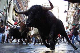 自從海明威的小說《太陽照常升起》問世,特別是他獲得諾貝爾文學獎以后,世界上越來越多的人就知道了西班牙的奔牛節(jié),知道了在那個最浪漫的國度有一種最浪漫的節(jié)慶,其宣泄程度遠非任何一種狂歡節(jié)可比。想一想斗牛場上那滿身是血、橫沖直撞、兇悍無比的大公牛,如果與它們一起狂奔共舞,而且是成千上萬的年輕人與它們一起瘋狂奔跑在一條狹窄的街道上,那該是何等的刺激!于是,在無數(shù)人的想像中,西班牙奔牛節(jié)就意味著勇敢、浪漫、刺激和瘋狂的宣泄,同時也必定險象環(huán)生。