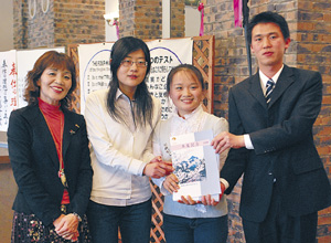 中新網(wǎng)3月5日電 據(jù)《日本新華僑報(bào)》報(bào)道,3月3日,日本和歌山縣“和歌山西輪轉(zhuǎn)俱樂部”在Laffina禮堂為即將畢業(yè)的留學(xué)生舉行了“畢業(yè)紀(jì)念相冊(cè)”贈(zèng)送儀式!昂透枭轿鬏嗈D(zhuǎn)俱樂部”的國(guó)際服務(wù)委員會(huì)的主井知子委員長(zhǎng)親手將“紀(jì)念相冊(cè)”交給了中國(guó)留學(xué)生鄭秋杰(26歲),金香梅(24歲)和代向斐(23歲)。據(jù)悉,該紀(jì)念相冊(cè)是和歌山縣專門為和歌山大學(xué)的留學(xué)生們制作的。