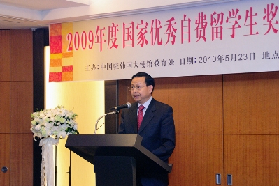 艾宏歌參贊介紹了“國家優(yōu)秀自費留學(xué)生獎學(xué)金”設(shè)立的背景和頒獎情況。他說,自2003年實施以來,總共有1900余名在外優(yōu)秀留學(xué)人員獲獎。2009年度獎勵規(guī)模達(dá)497人,其中在韓自費留學(xué)生13人獲獎。他希望同學(xué)們牢記張大使的囑托,奮發(fā)努力,為祖國的建設(shè)和中韓關(guān)系發(fā)展發(fā)揮積極作用!