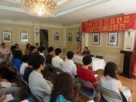 駐美使館領(lǐng)事部陳雄風參贊在會議上介紹了領(lǐng)事保護協(xié)助的內(nèi)容,希中國留學(xué)人員在美日常生活中,要從相互尊重、真誠相待、寬容大度、嚴于律已、把握分寸、尊重差異、積極融入、文明做人、心系祖國的態(tài)度出發(fā),遵守法律,學(xué)會與人相處,減少安全隱患。他還介紹了在需要時,如何向中國外交機構(gòu)提出領(lǐng)事保護協(xié)助申請的具體做法和要求。