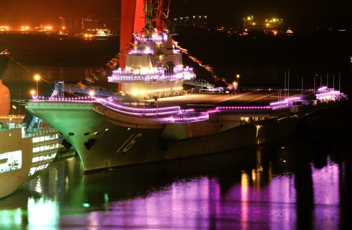 網(wǎng)友拍我航母平臺“遼寧艦”節(jié)日期間霓虹燈閃亮裝點(diǎn)海灣