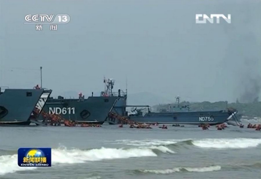 戰(zhàn)士們從兩棲登陸船上跳下迅速占領(lǐng)海灘