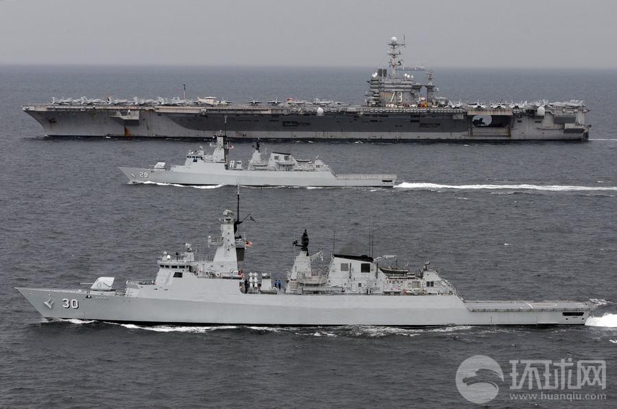 馬來西亞海軍戰(zhàn)艦與美軍華盛頓號(hào)航母組成編隊(duì)航行