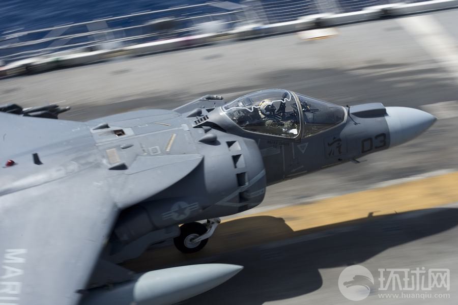 在此次美菲聯(lián)合登陸演習中,一架AV-8B鷂式戰(zhàn)斗機從好人理查德號兩棲攻擊艦上起飛。