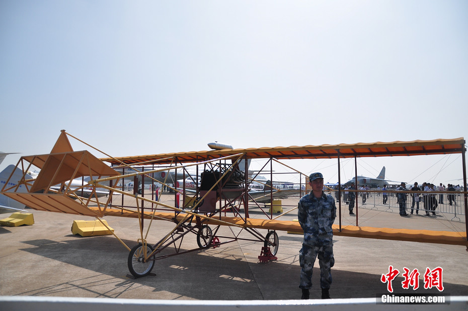 馮如2號飛機(jī)是中國人自行設(shè)計(jì)、制造并成功試飛的第一架飛機(jī)。該機(jī)于1911年1月18日由“中國航空之父”--馮如試飛成功。航展上展出的為1:1復(fù)制品。陳海峰 攝