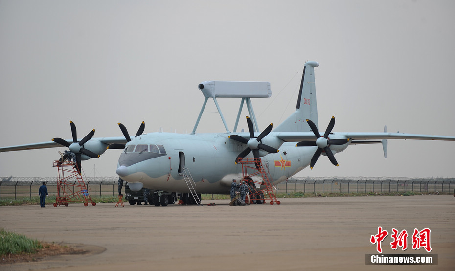 空警-200機載雷達(dá)天線類似體操用的平衡木,是中國自行研制的一種輕型、全天候空中型預(yù)警飛機,在運8C型機基礎(chǔ)上進行了80%以上改動而成。曾在2009年國慶閱兵中現(xiàn)身。陳海峰 攝