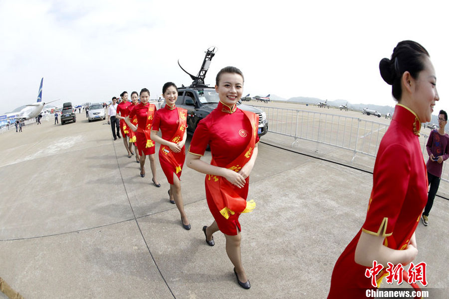 2012年11月12日,2012珠海航展開幕前夕,禮儀小姐身著旗袍亮相機場,盡顯曲線美。圖片來源:東方IC 版權(quán)作品 請勿轉(zhuǎn)載