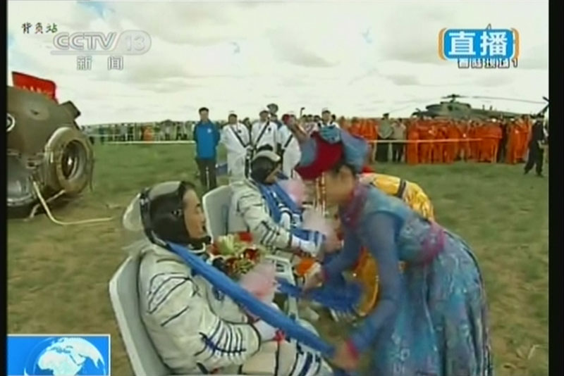 3名航天員獲贈(zèng)哈達(dá)。(視頻截圖)