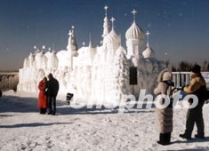 圖:盡顯俄式風格的雪雕俄羅斯教堂