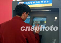 十七日,上海正式打響為期四十天的“春運保衛(wèi)戰(zhàn)”。為緩解春運期間旅客售票難的問題,上海推出“鐵路客票自動售票機”,一位旅客應用電腦觸摸信息購票。作者:湯彥俊