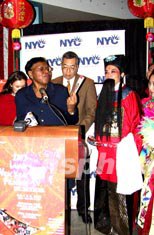 美國(guó)亞美商業(yè)發(fā)展中心邀請(qǐng)紐約市旅游局共同舉辦中國(guó)農(nóng)歷羊年新春慶;顒(dòng)。一月十六日,主辦者在曼哈頓中城舉行記者會(huì),亞美商業(yè)發(fā)展中心總裁王章華(中)介紹帝國(guó)大廈亮燈慶祝以及紐約華埠即將舉行的多項(xiàng)活動(dòng)。曼哈頓區(qū)區(qū)長(zhǎng)費(fèi)絲(左)特意前來祝賀,她拿著剛剛出版的《華埠旅游指南》愛不釋手,希望慶祝活動(dòng)能推動(dòng)華埠和曼哈頓的經(jīng)濟(jì)復(fù)蘇。作者:趙海燕