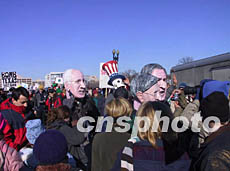 數(shù)萬美國人十八日中午在華盛頓舉行大規(guī)模反戰(zhàn)游行,示威者裝扮成布什、切尼、拉姆斯菲爾德“三巨頭”,諷刺他們“販賣”戰(zhàn)爭(zhēng)。作者:余東暉