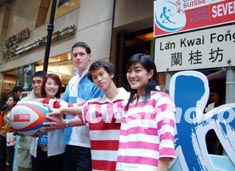 “香港國(guó)際七人欖球賽”將于3月底于香港大球場(chǎng)舉行,1月23日模特在中環(huán)蘭桂坊展示今屆欖球賽的服飾。洪少葵 攝
