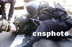 在東四十條橋西側(cè)200米處,3輛警車停放在路中間擋住去路,地面上橫著一排道釘。面對(duì)荷槍實(shí)彈的民警,“劫持者”終于放棄了抵抗,停下車后,依次跳下車來束手就擒。特警們沖上前去,干凈利落的擒拿動(dòng)作令周圍不明所以的行人誤以為真的發(fā)生了搶劫案。