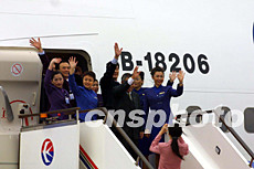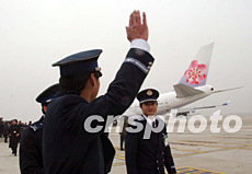 載有春節(jié)返鄉(xiāng)探親臺商及其眷屬的臺灣“華航”包機(jī),一月二十六日上午十一時(shí)三十分左右從上海浦東機(jī)場順利起飛。圖為“華航”機(jī)組人員起飛前揮手作別。