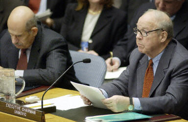 聯(lián)合國監(jiān)核視委主席布利克斯(右)和國際原子能機構(gòu)總干事巴拉迪向聯(lián)合國安理會匯報對伊武器核察工作情況。