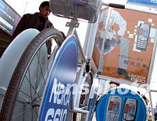北京春節(jié)前夕的手機(jī)市場(chǎng)更加火爆,一家手機(jī)公司別出心裁的利用自行車(chē)在街頭做起了廣告。作者:杜洋