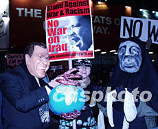 當(dāng)?shù)貢r(shí)間二月五日,在鮑威爾向聯(lián)合國提交伊拉克擁有大規(guī)模殺傷性武器新證據(jù)的同時(shí),數(shù)百人在紐約時(shí)代廣場(chǎng)集會(huì),反對(duì)美國對(duì)伊拉克開戰(zhàn)。傍晚時(shí),越來越多下班的紐約人自動(dòng)加入,集會(huì)遂演變?yōu)檠刂氖中羞M(jìn)的反戰(zhàn)示威游行。圖為帶著布什面具的示威者。作者:龔文謨