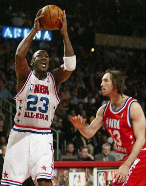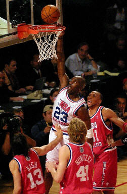 去年以狀元秀身份加盟休斯頓火箭隊的中國球員姚明,以首發(fā)身份為西部聯(lián)盟全明星隊出戰(zhàn)。比賽剛開始,姚明就接到隊友傳球,扣籃成功,為球隊貢獻(xiàn)兩分。在上半場,姚明上場10分鐘,1投1中,2個籃板球,2分。