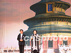 來(lái)自中國(guó)的老歌唱家十二日晚為一千名華盛頓華人華僑奉獻(xiàn)經(jīng)典老歌,受到熱烈歡迎。這是中國(guó)著名歌唱家王昆(右)在向觀眾介紹男高音歌唱家郭訟。作者:余東暉