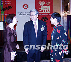 香港特區(qū)駐紐約經(jīng)濟貿(mào)易辦事處二月十二日晚在曼哈頓舉行羊年新春酒會。圖為中國常駐聯(lián)合國代表王英凡(中)、香港駐美國總經(jīng)濟貿(mào)易專員韋玉儀(左)、紐約駐香港經(jīng)貿(mào)辦事處主任何寶珠在酒會上互致問候。作者:龔文謨