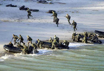 為鏟除阿布沙耶夫恐怖組織,美海軍陸戰(zhàn)隊18日在馬尼拉以南島嶼與菲律賓軍隊舉行聯(lián)合軍事演習(xí)。圖為:美海軍陸戰(zhàn)隊西棲搶灘登陸。