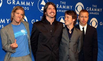 “FOO FIGHTER”樂隊憑借《All My Life》獲得最佳硬搖滾演奏獎。樂隊靈魂人物主唱戴夫(圖中左二)是90年代紅遍全球的著名非主流樂隊Nirvana(涅磐)的鼓手。