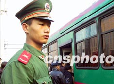 二月二十六日,中國“兩會(huì)”即將召開,一名武警在北京巴士車站維持秩序。作者:杜洋