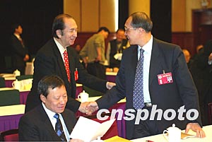 正在北京出席全國(guó)政協(xié)十屆一次會(huì)議的何鴻燊與鄒哲開(kāi)在港澳政協(xié)委員聯(lián)組會(huì)上互致問(wèn)候。作者:毛建軍