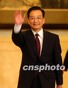 中國(guó)新任總理溫家寶三月十八日在北京人民大會(huì)堂舉行中外記者招待會(huì),他入場(chǎng)時(shí)向云集的新聞界招手致意。作者:賈國(guó)榮