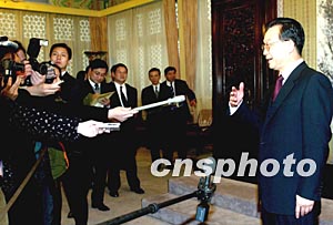 在回答記者們的提問后,溫家寶關(guān)心地問記者們“你們拍攝好了嗎!