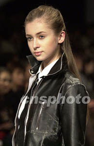 在二00三年東京秋冬時裝展上,日本各路時裝設(shè)計師順次登場發(fā)表新作。圖為模特28日晚演示著名時裝設(shè)計師鳥居由紀的皮革新作。作者:陶光雄
