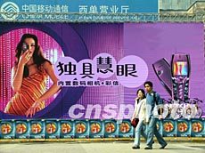 北京西單手機(jī)廣場四月新春豎起巨幅外國手機(jī)廣告。當(dāng)前市場競爭激烈,中外廠商為廣告宣傳費盡心機(jī)。作者:杜洋