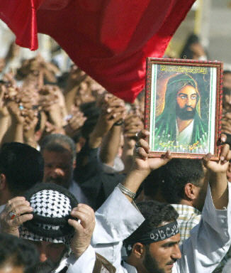 4月14日在伊拉克的南部城市納杰夫,伊拉克的什葉派教徒舉行了大規(guī)模的反戰(zhàn)示威游行。