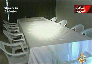 其中一個(gè)房間是一個(gè)裝飾有伊拉克鷹的簡(jiǎn)陋的錄像室。他可能在這里錄下了他的“不投降”的電視講話。后面的背景窗簾正好和發(fā)表講話那天的背景一致。在一臨時(shí)會(huì)議室里有塑料椅子和鋪著床單的桌子,在另一房間里則還有放著皺巴巴的毯子的一些床鋪。(春風(fēng))