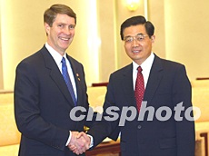 四月二十一日,中國(guó)國(guó)家主席胡錦濤在人民大會(huì)堂會(huì)見(jiàn)由參議院多數(shù)黨領(lǐng)袖比爾·弗里斯特率領(lǐng)的美國(guó)參議院訪華代表團(tuán)。