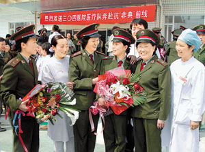 下午2時(shí),304醫(yī)院舉行莊嚴(yán)而簡短的歡送儀式。記者看到,30名英姿勃勃的醫(yī)療隊(duì)員在全院戰(zhàn)友的鮮花和掌聲中登上汽車,院領(lǐng)導(dǎo)親自送他們赴定點(diǎn)醫(yī)院。記者還在海軍總醫(yī)院、307等醫(yī)院的政治部門看到了數(shù)千份請戰(zhàn)書、決心書。