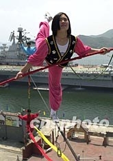 “高空飛燕”王海燕二十八日在深圳明思克航母熱身。她將在航母?罩g高六十米、長(zhǎng)二百多米、直徑二十一點(diǎn)五毫米的鋼索上生存三十一天。作者:陳文